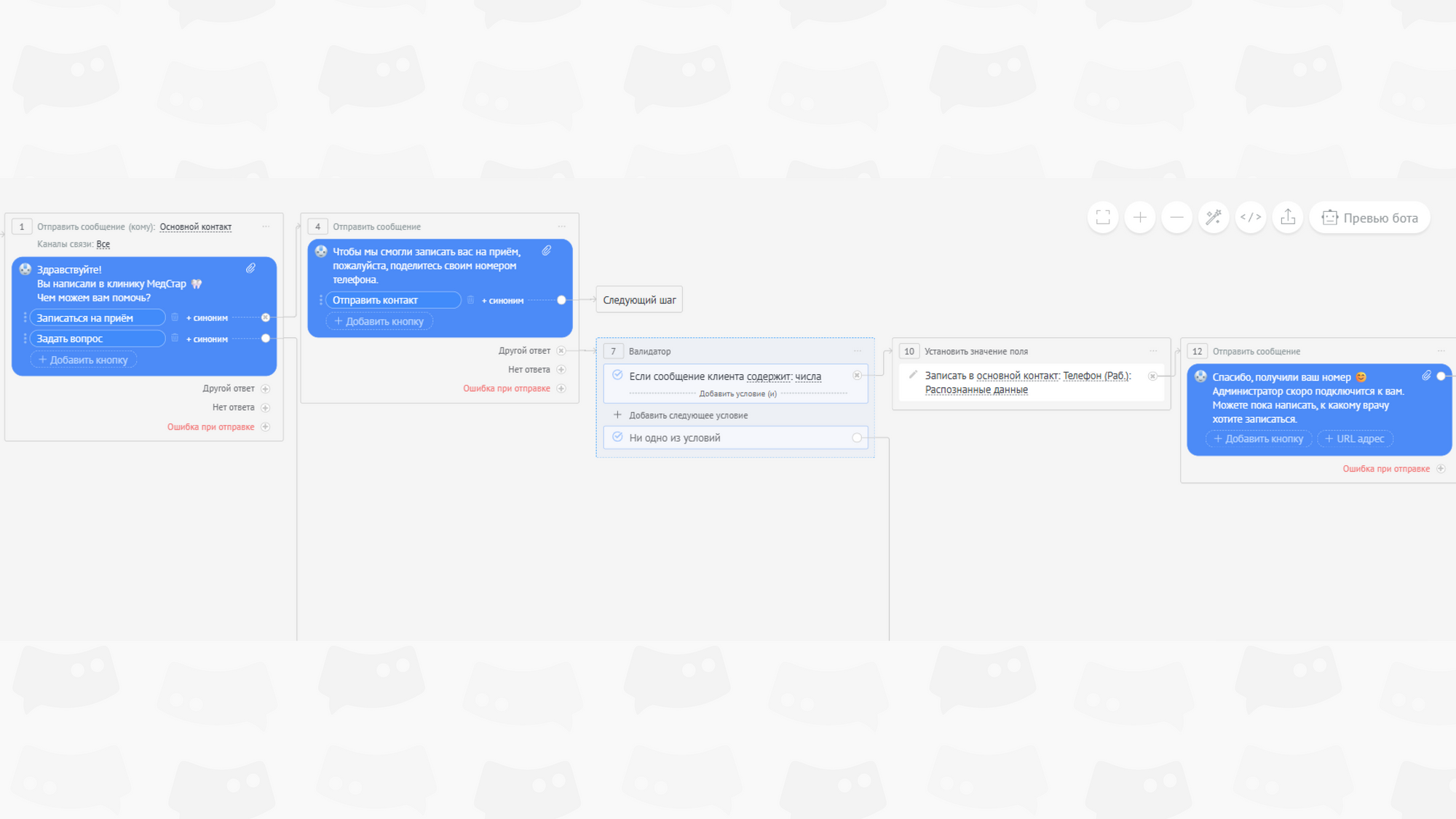В интеграции также можно запросить номер телефона у пользователя. Это работает по такой же логике, что и в Telegram. Чтобы получить номер, отправьте клиенту кнопку с текстом «Отправить контакт».