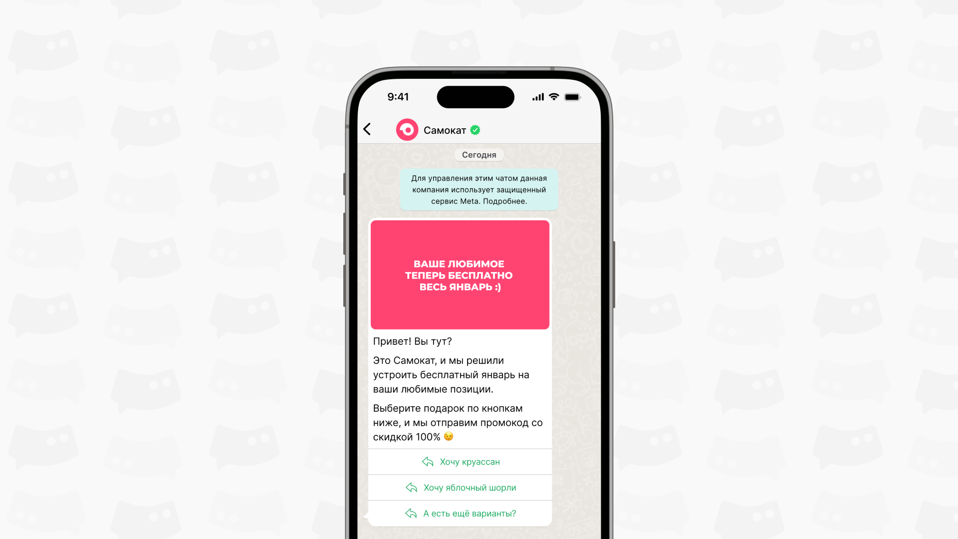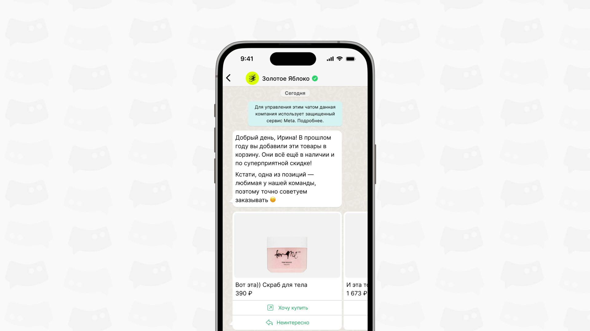 Напомните клиенту о брошенной корзине. Покажите товары прямо в чате с помощью шаблонов «Карусель» или «Каталог», или используйте шаблон «Промокод» с ограниченным сроком действия — клиент сможет скопировать его и сразу перейти на сайт. Так вы сможете повысить интерес и увеличить шансы на покупку.